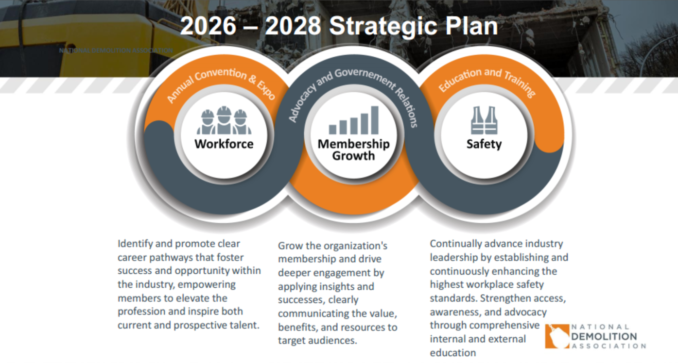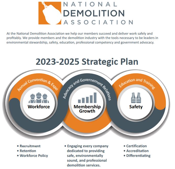 At the National Demolition Association we help our members succeed and deliver work safely and profitably. We provide members and the demolition industry with the tools necessary to be leaders in environmental stewardship, safety, education, professional competency and government advocacy.