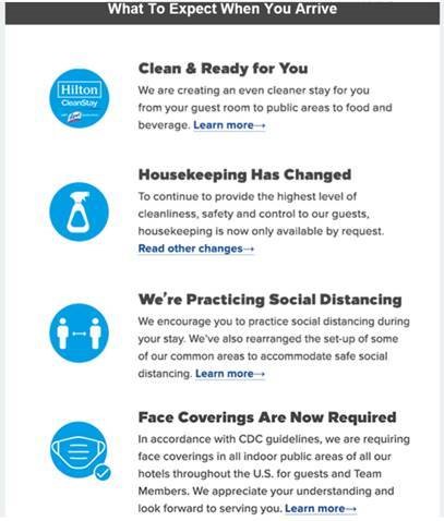 The Hilton has adopted new safety protocols in light of COVID-19. You will receive detailed information, as listed in the image on the right, with your confirmation email. When you arrive at the Hilton you can expect new protocols including but not limited to: